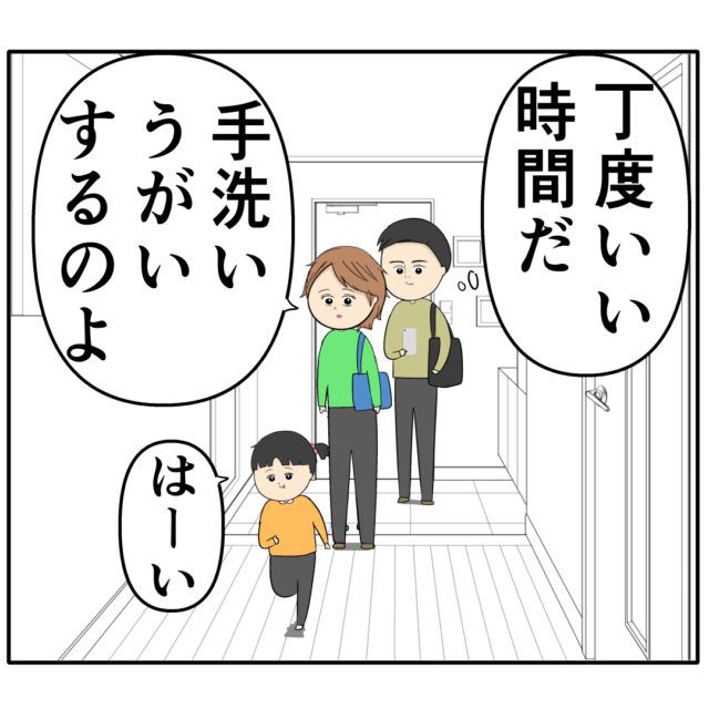 密かにスマホをチェックして、ちょうどいい時間だとにんまりする良し男さん。それに気づかず、すみれさんは「手洗いうがいするのよ」とほの香ちゃんに声をかけていました。