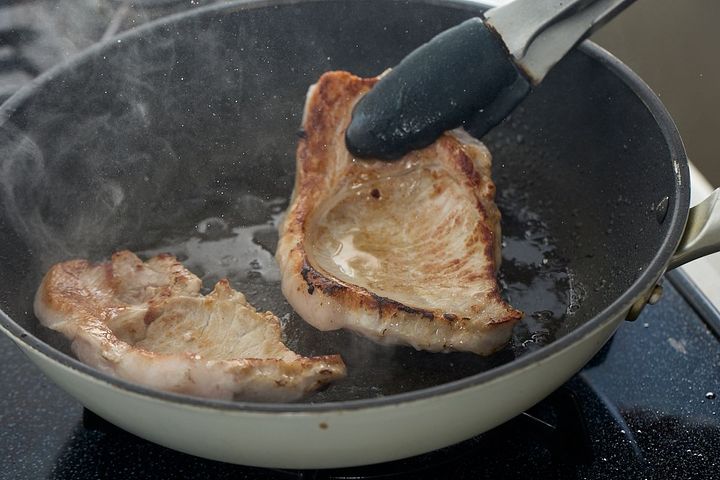 3.フライパンにサラダ油をひいて、(1)の豚肉を入れ、両面をこんがりとするまで中火で焼いたら、器に取り出す。