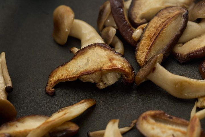 4.同じフライパンにしめじ、しいたけを入れ、こんがり焼き目がつくまでさわらずに焼く。