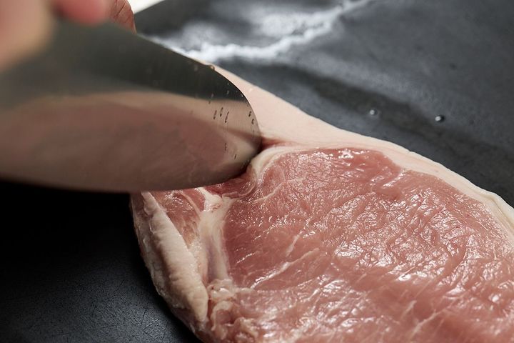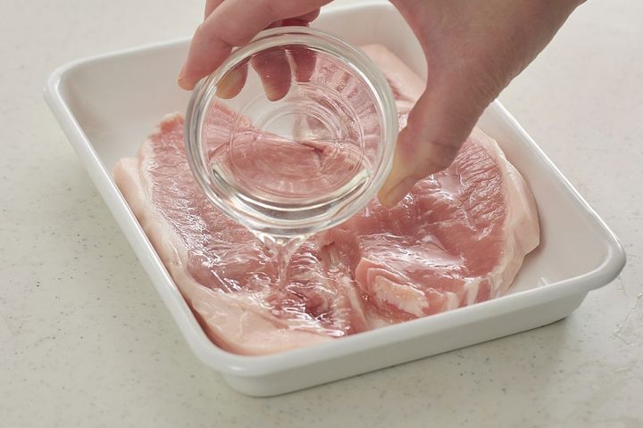 ポイントは、豚肉の筋の部分に包丁の刃先で切り目を入れることと、酒をふりかけて常温にもどしておくこと。