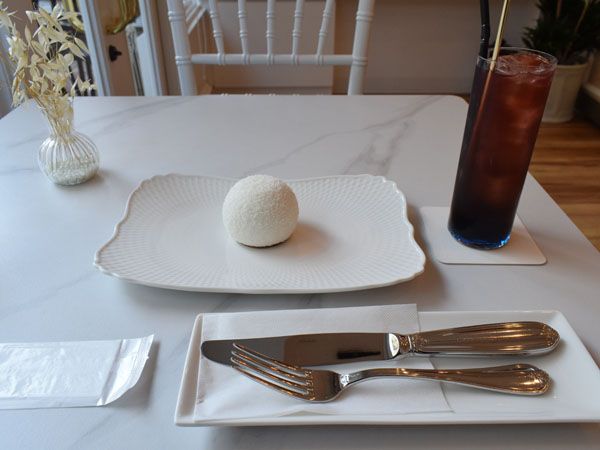 伝統菓子オンデオンデを洋菓子にアレンジしたオリジナルスイーツ「オンデオンデムース」(680円)と、スイートティー(850円)を選びました。
