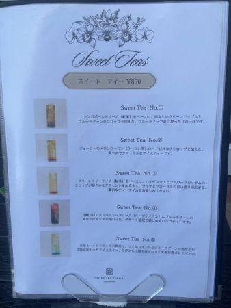 同店のオリジナルティーをアレンジした「スイートティー」は、わかりやすい写真つきメニューです。 推しカラーや言葉の印象で選ぶのもいいですね。