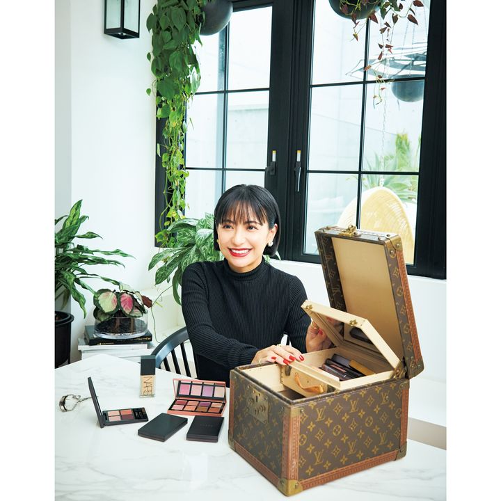 洗面台の生活雑貨やインテリアは自身のブランドで統一。バスマットとタオルもTHE WEEKEND HOTEL。その時使う美容アイテムだけを洗面台に出し、使ったらすぐ元の収納に戻します。ゴミ箱やティッシュなど生活感に繫がるものはビルトインで常に美しい視界をキープ。床の雑巾がけも毎日します。美の原点となる環境を正していると、自然と美意識が高まり、表情や仕草もよい雰囲気に。心地よく美容に向き合うことで、美の好循環が生まれています。