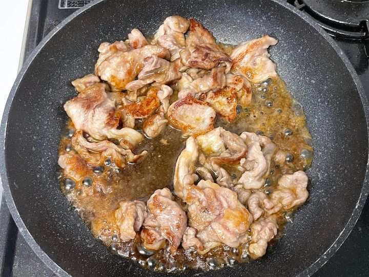 3.中強火で再度火にかけたら[A]を入れ、水分を飛ばしながら炒め、タレを絡めます。