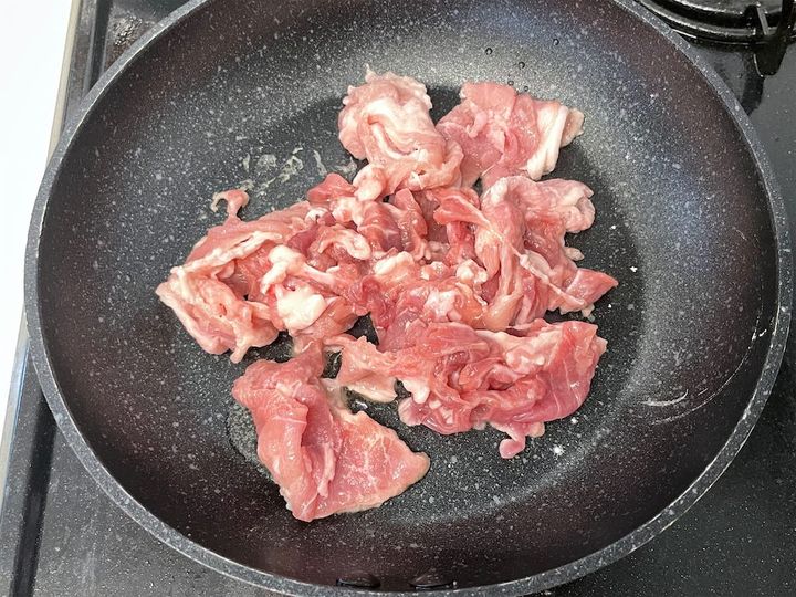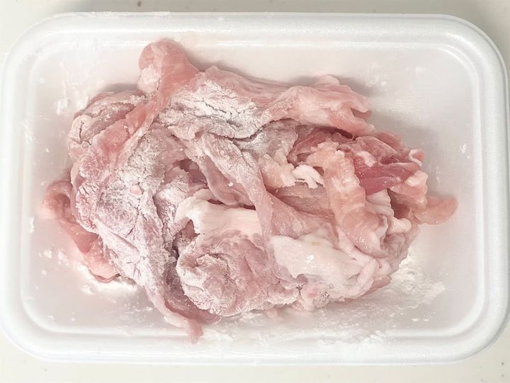 バットに片栗粉を広げ、豚肉に片栗粉をまぶします。