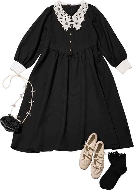 黒×白のバイカラーで着こなしにメリハリをプラス。ガーリーなワンピもモノトーンなら高潔な印象に仕上がる。レース襟ワンピース LL~4L ¥6,930/クレット 2WAYリボンがま口ミニバッグ ¥1,299/GRL バッグに付けたパールリボンスマホショルダー ¥1,100/ラティス ソックス ¥2,750/Blondoll(Blondoll 新丸の内ビル店) ギャザーリボンパンプス 23.5、24.5cm ¥9,900/osharewalker