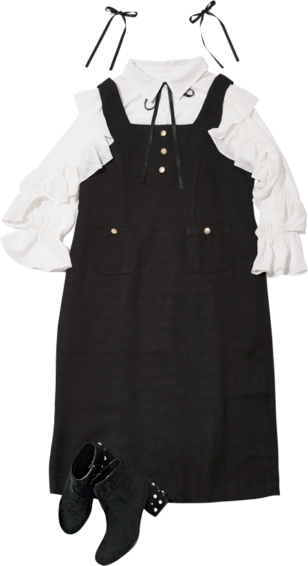 シックな雰囲気が漂うツイード素材のジャンスカをドレスダウン。親しみやすいムードを纏っちゃおう。ツイードジャンパースカート 1~3 ¥5,721/09WOMEN アソートボウタイフリルスリーブブラウス 3L、4L ¥5,995/Louiosy リボンクリップ 2個セット¥550/WEGO パールヒールショートブーツ 22.5~25cm ¥2,799/GRL