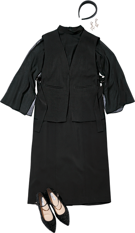 お仕事からオケージョンまで幅広いシーンで活躍しそうなお得セット。ジレ付きスリットスリーブワンピース S~5L ¥19,800/POURVOUS カチューシャ ¥1,540/OSEWAYA(お世話や) イヤリング ¥4,070/コトモノマルシェ ルミネエスト新宿店 スパンコールパンプス 22~25.5cm ¥15,400/NICAL クラ