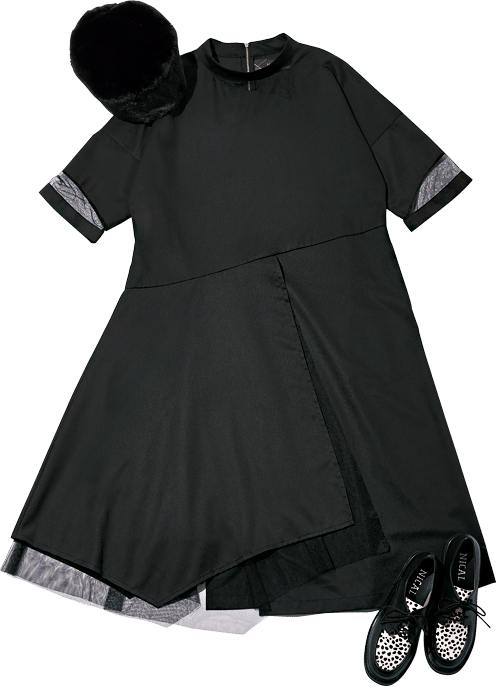 デザイン性の高いワンピは、全身の色をコンパクトにまとめるとモード感がアップする。切り替えアシンメトリーワンピース フリーサイズ ¥7,980/kOhAKU(osharewalker) フェイクファーハット ¥2,750/スピンズ レースアップシューズ 22~25.5cm ¥17,600/NICAL