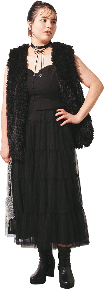 ティアードチュールジャンパースカート LL~4L ¥6,589/Re-J&SUPURE フェイクファーベスト L-LL相当~10L相当 ¥4,389~¥4,939/スマイルランド イヤリング ¥330/ラティス チョーカー ¥770/OSEWAYA(お世話や) チャーム付きチョーカー ¥1,320/スピンズ メタリックキルティングショルダーバッグ ¥1,699/GRL ストレッチショートブーツ M~3L ¥6,589~¥7,909/ニッセン