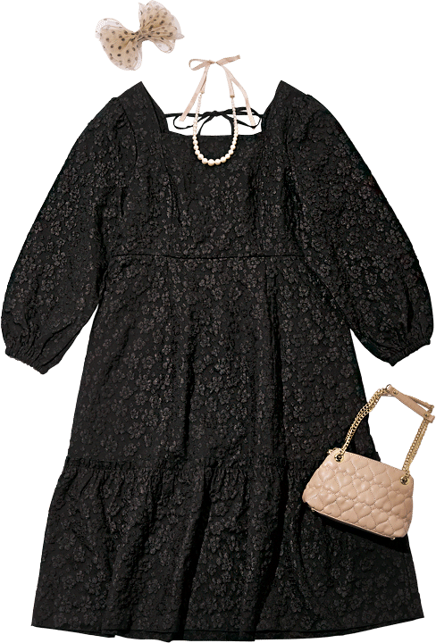 さり気なくかわいいジャカード織りの花柄ワンピ。黒だから小物で甘さを足してもトゥーマッチにならない。フラワージャガードワンピース LL~4L ¥7,995/Louiosy ドット柄リボンバレッタ ¥2,200、リボン付きパールネックレス ¥2,310/共にOSEWAYA(お世話や) ハート柄キルティングバッグ ¥15,400/ダイアナ(ダイアナ 銀座本店)
