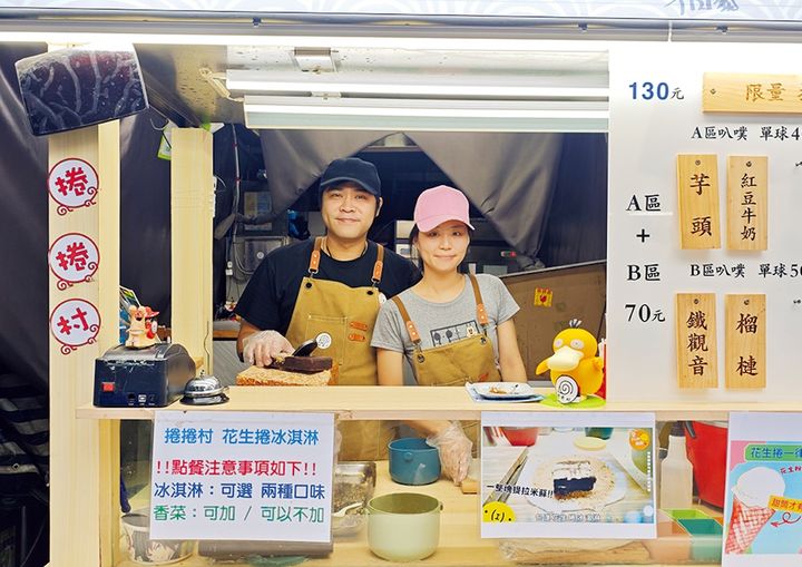 台北郊外の風光明媚な行楽地、淡水。多くの飲食店が並ぶが、ここは路地のなかにある可愛らしいつくりの店。店先には「一捲入魂」(魂を込めて一捲き)と書かれた幟がはためき、店主の彭鎮遠さんの熱い思いが伝わってくる。彭さんは花生捲の本場である宜蘭県で食べたものが忘れられず、台北中を探し回ったが、理想とする味を見つけられなかった。そこで一念発起し、5年前に開業。アイスは人工添加物を一切用いず、自家製にこだわる。原料となるフルーツは小規模農家から仕入れているものもある。生地は半世紀の歴史を誇る店に特注し、ふんわりと柔らかな食感。写真は香りのよいグァバ味、爽やかな風味の海塩入りレモン味、優しい甘さのタロイモ味。種類は季節によって変わる。