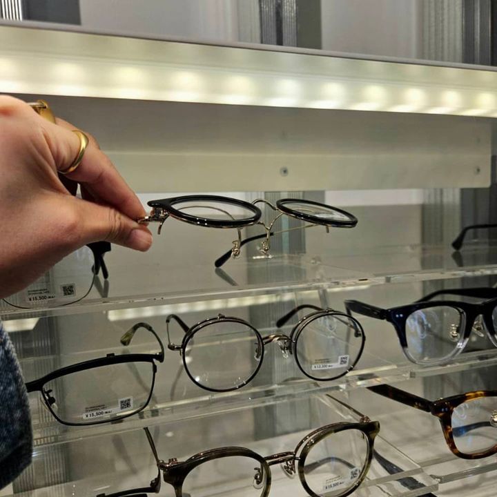 大量の跳ね上げ式メガネを発見! これ、基本的には近視の方が遠くを見るためにレンズを使い、近くを見る際は跳ね上げて裸眼で見ることを想定しているそうですが、老眼鏡でもOKとのこと。メガネに不慣れな分、かけ外してどこかに置いて踏んじゃったりするのがコワイ私はいったんこちらでトライすることに! 大きめの黒ぶちメガネが欲しいなと思っていたのもあり、イイ感じのウェリントンフレームを発見したので迷わず決定しました。