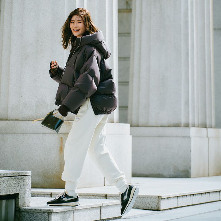 長めのリブニットにサムホール付きで手袋いらず。ダウンコート[耐水、保温]¥93,500〈デュノ〉スウェットパンツ¥29,700スニーカー¥35,200〈ともにオートリー〉(すべてトヨダトレーディング プレスルーム)ピアス¥102,300(ウノアエレ/ウノアエレ ジャパン)ソックス¥1,430(タビオ)バッグ¥29,700(トーヴ/アンソロジー)