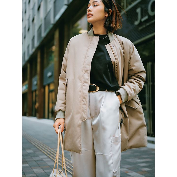 首元や袖口のリブ使いなどMA-1をベースに、ノンキルトデザインが新鮮。すっきり見えるよう、ダウン量も調整してより幅広いシーンで活躍。