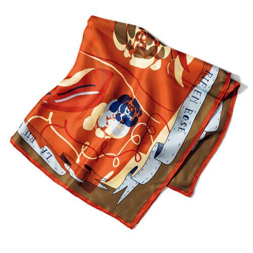 バラのモチーフを重ねたレトロ柄スカーフを、首元やバッグに添えてコーデのアクセントに。