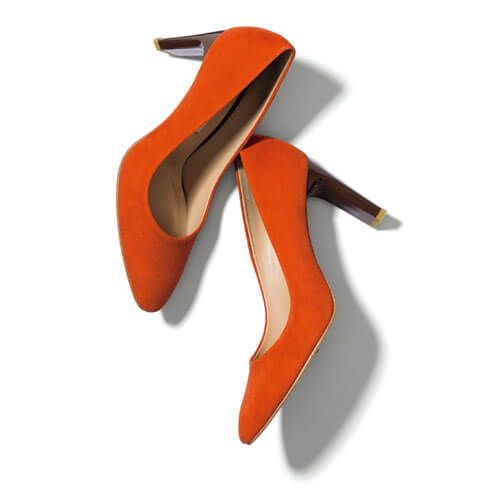 オレンジとブラウンを混ぜたようなテラコッタカラーで品よく。太めの板ヒールで安定感も。
