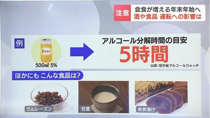 ラムレーズンや甘酒、奈良漬けなどの多くは、アルコール度数1%未満のものが多く、食べて直ちに飲酒運転の基準を越えるとは考えづらいとされています。