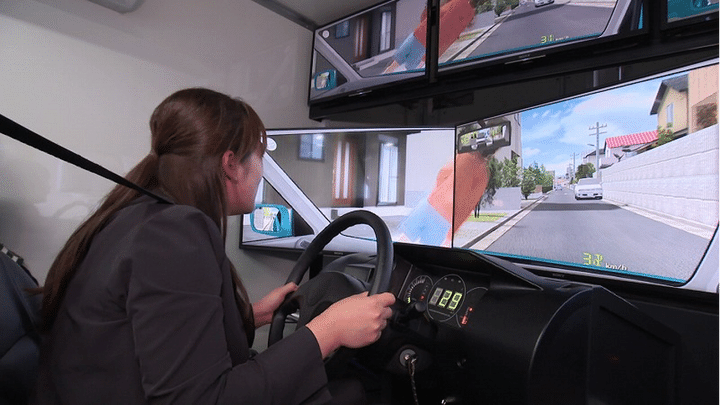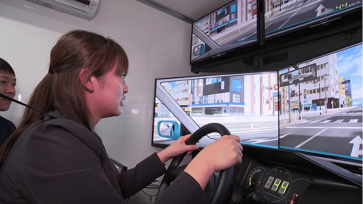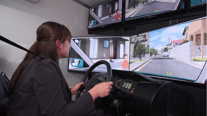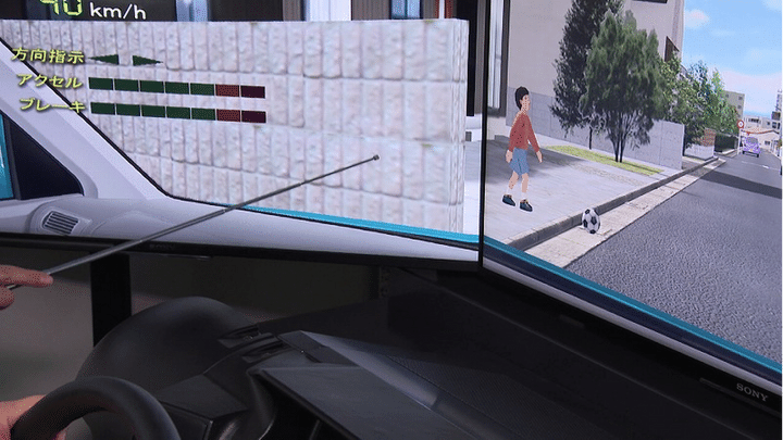 シミュレーターの画面には、道路右側から飛び出してくる女性の姿…。
