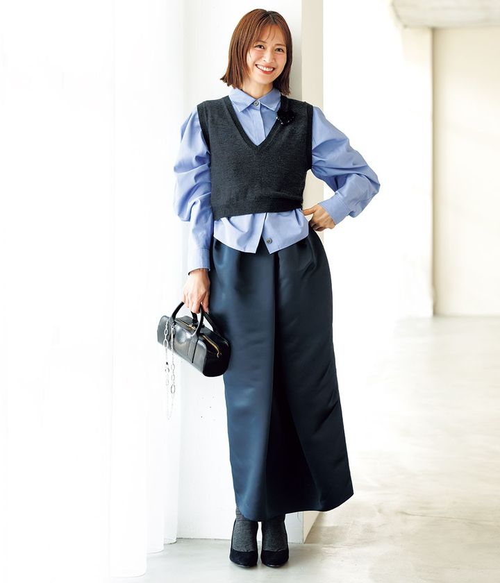 甘派の定番・ふんわりスカート愛用派もじわじわとコクーンタイプへ移行中。光沢のあるネイビーは黒ほど強くなく品よくまとまり、お仕事や学校などのきちんとシーンにも最適。シャツ×ニットベストの優等生コーデも新鮮に映ります。