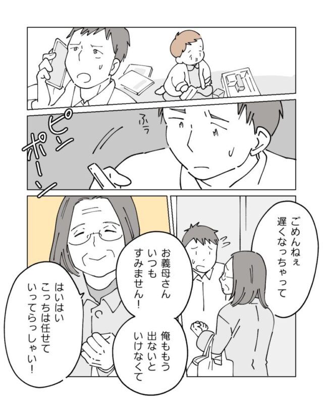 翔くんの様子を見ながら仕事をする良平さん、少しすると「ごめんねぇ遅くなっちゃって」ちひろさんのお母さんが到着しました。「お義母さん、いつもすみません!俺ももう出ないといけなくて」慌てて挨拶する良平さんに、「はいはい。こっちは任せていってらっしゃい!」お母さんは快く送り出してくれました。