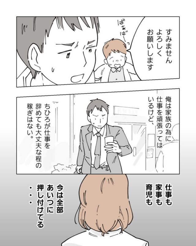 「すみません。よろしくお願いします」そう言って家を出た良平さんは、「俺は家族の為に仕事をがんばってはいるけど、ちひろが仕事を辞めても大丈夫なほどの稼ぎはない」そう呟いた後、「仕事も家事も育児も・・今は全部あいつに押し付けてる・・」そう思って愕然としました。