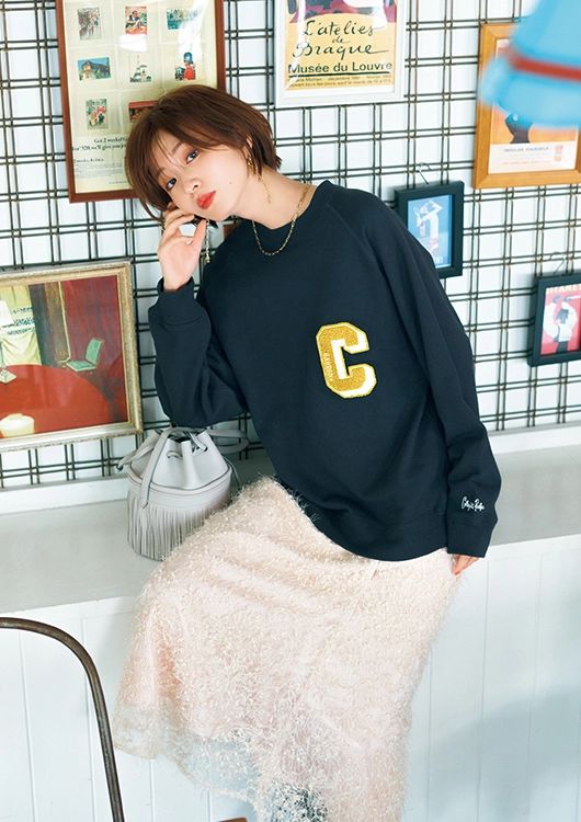 ロゴ入りスウェット¥9,350/シップス エニィ ×カレッジエイト パシフィック(シップス) スカート¥19,800/CELFORDルミネ新宿2店 ピアス¥30,800、ネックレス¥20,900/ともにローラ ロンバルディ(八木通商) ダブルフィンガーリング¥2,970/シースキー(ロードス) バッグ¥148,500/J&M デヴィッドソン