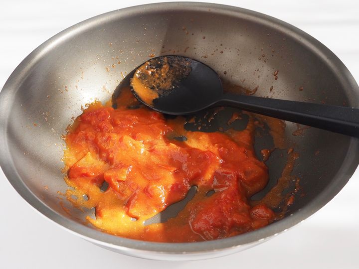 鶏肉を加熱した際に出る肉汁には旨味があるので、絶対に捨てないで! その旨味を使って、トマトベースのソースに仕上げます。
