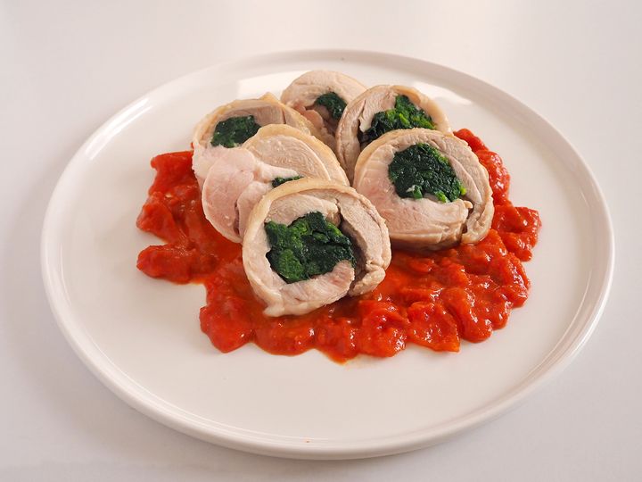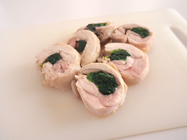 レンチンしたほうれん草を鶏肉で巻いたら、さらに電子レンジで加熱すれば出来上がり!