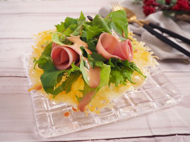 2. チーズが固まって形がついたら、チーズをクッキングシートから外す(この時、安定しづらい場合は、小さいカップや器の上にチーズをのせると○)。チーズの内側に、お好みの野菜やハムを盛り付ける。