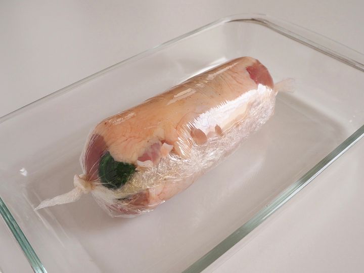 2. ラップを2枚、少し重なるようにして大きめに広げる。その上に1の皮目を下にしてのせる。加熱したほうれん草をのせ、手前からしっかり巻く。ラップできつく巻き、左右を縛る。竹串で2箇所穴を開け(2箇所が直線状にならないよう、ランダムに開ける)、耐熱皿にのせる。