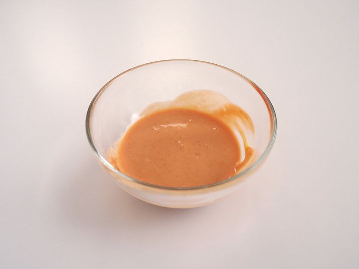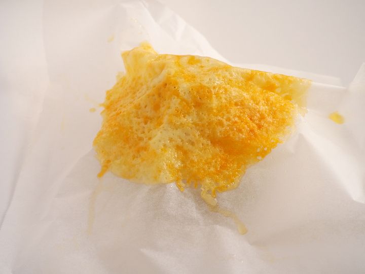 1. クッキングシートの上にチーズを直径15cmくらいの円状に広げる。そのまま電子レンジ(600W)で1分程度加熱する(チーズが完全に溶けて、表面が沸々としたらOK)。取り出したら、クッキングシートごと裏返したお茶碗の上にのせる。そのまま10分程度置く。