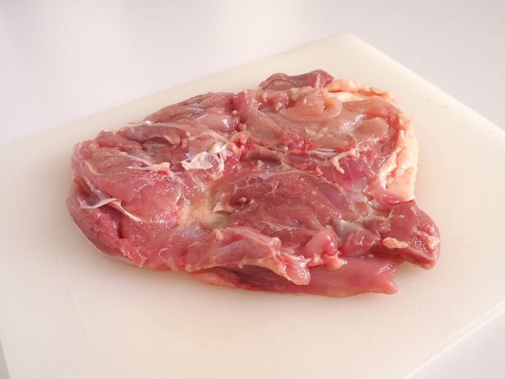 1. 鶏もも肉に包丁で切り込みを入れ、厚みを整える。にんにくチューブを全体に塗り込み、塩、こしょうを全体に振る。