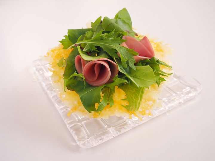 チーズカップの中にはサラダを詰めて、オーロラソースをかければ完成。ハムを半分に折ってからくるっと巻いてサラダに差し込むと、一層かわいい見た目になりますよ。