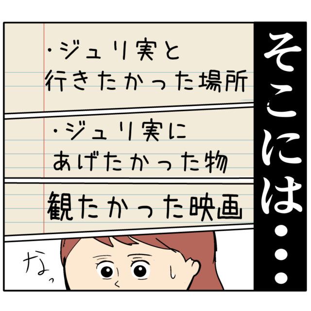 そこには、『ジュリ実と行きたかった場所』『ジュリ実にあげたかった物』『観たかった映画』などと箇条書きで書かれていました。