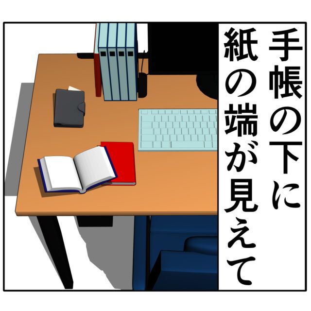 ろみ緒さんの机に置かれた手帳の下に紙の端が見えためいさん。