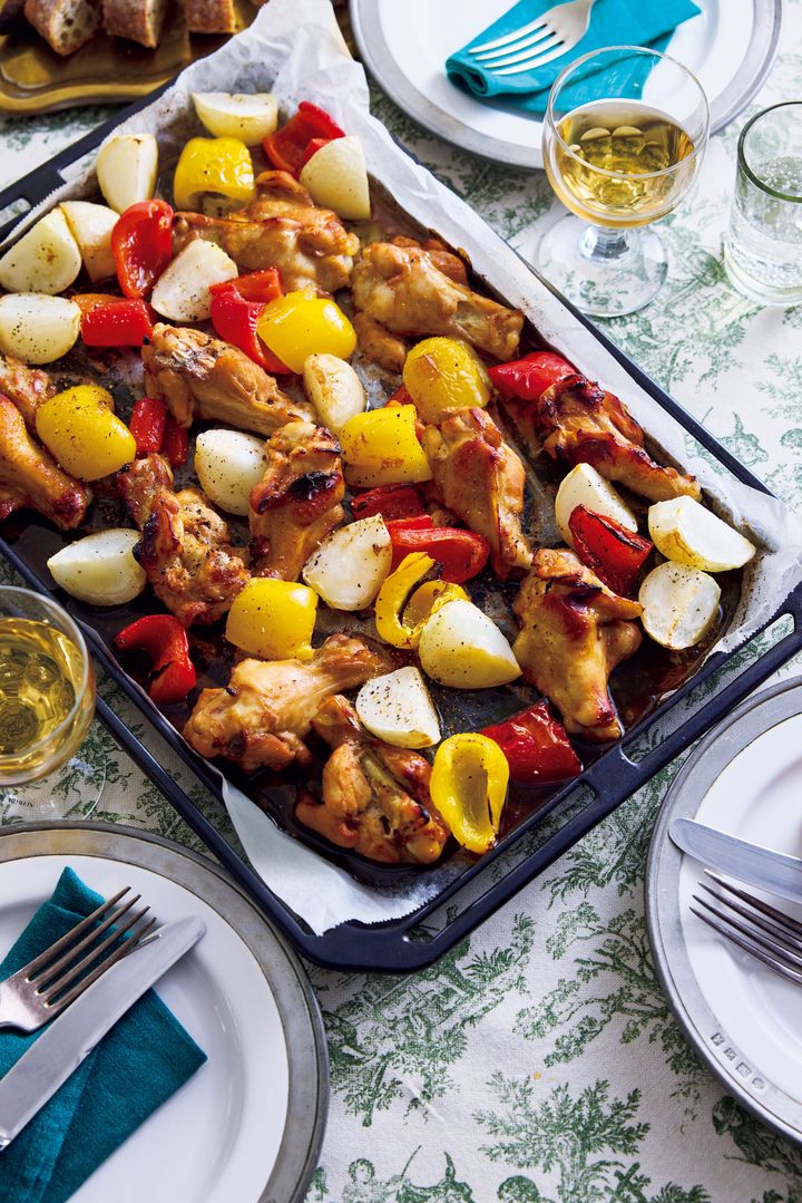 オーブンを200℃に温めておく。オーブンの天板にオーブン用シートを敷き、オリーブオイル小さじ1を広げる。(1)の鶏肉と(2)の野菜を重ならないように並べ、200℃のオーブンでこんがりとするまで20分ほど焼く。仕上げに粗びき黒こしょう適宜をふる。