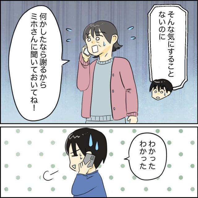 「そんな気にすることないのに」とタケルさんが繰り返し言うも、「何かしたなら謝るからミホさんに聞いておいてね!」と言う義母の言葉を「わかった。わかった」最終的には受け入れることにしたのでした。