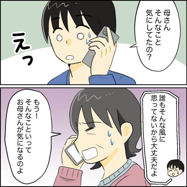 義母の言葉を聞いたタケルさんは「えっ?母さん、そんなこと気にしてたの?」と言い、「誰もそんな風に思ってないから大丈夫だよ(笑)」と答えました。それでも「もう!そんなこといって!お母さんが気になるのよ」とどうにも不安を拭い去れない義母。