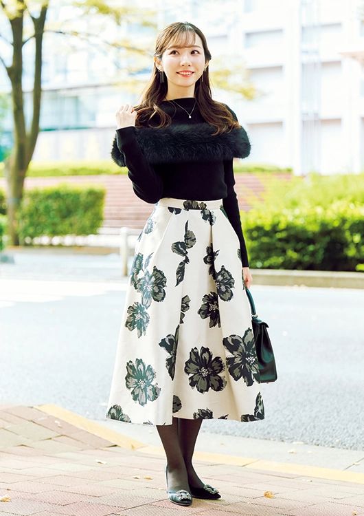 「CELFORDのケープトップスはシルエットが可愛くてお気に入り。トップスがメインなので、アウターを着なくても楽しめるドライブデートをイメージしてみました。黒でシックにまとめつつ、大きめの花柄やキラキラとしたアクセや靴で夜でも華やかな印象に」(イメージコンサルタント/小林芽生さん・31歳)