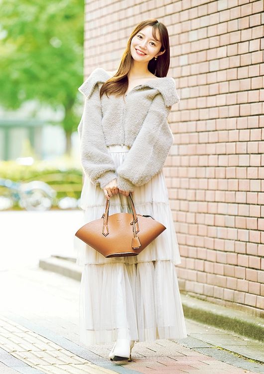 「クリスマスなのでいつもより甘めにコーディネート。31 Sons de modeのワンピースはオフショルっぽく着られるふわふわのシャギーカーデ付きで、きれいなデコルテ見せが叶います。冬らしく女っぽい肌見せコーデでクリスマスマーケットに行きたいな♡」(商社勤務/藤原美歩さん・27歳)