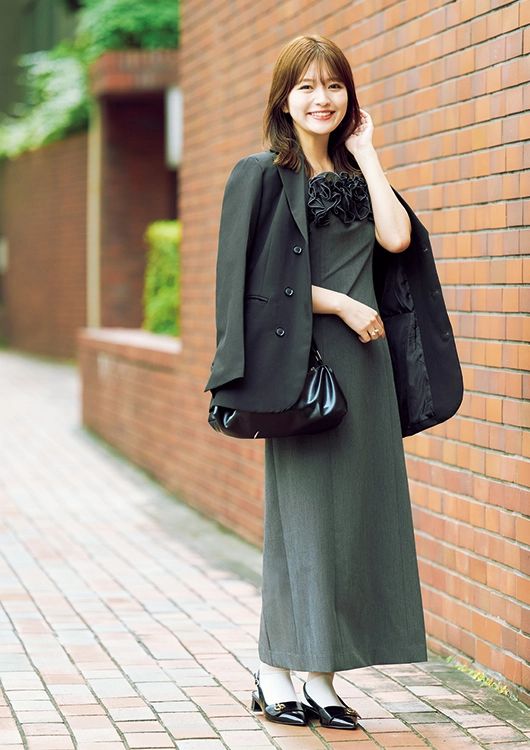 「LAGUNAMOONのワンピースは、胸元のコサージュモチーフが華やかでコーデのアクセントに◎。足元は白ソックスを合わせて、明るさと甘さを足したのもポイント。モノトーンで大人っぽくまとめたので、ディナーのあとホテルの部屋でゆっくりワインを飲みたいです」(モデル/𠮷村桃子さん・24歳)