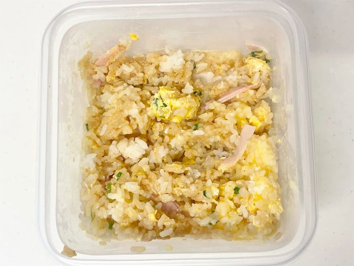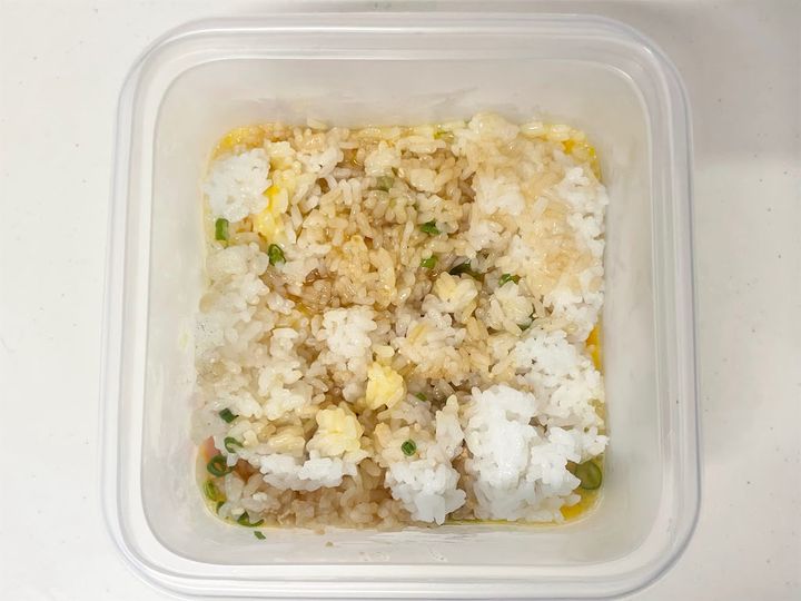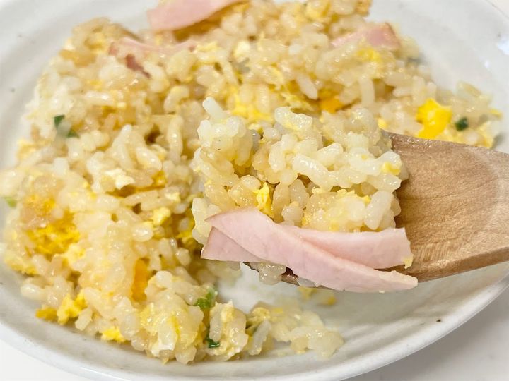 実際には炒めていないのですが、ご飯と具材がしっかり絡んで炒飯風に仕上がっています。サラダ油とゴマ油がダブルで使われているため、米がコーティングされてパラパラになるかと思いきや、少しべちゃっとして油っぽく感じました。ゴマ油だけにするか、サラダ油は小さじ1くらいに減らすと良いかもしれません。