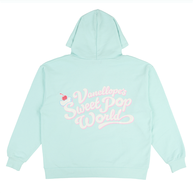 ヴァネロペをモチーフにしたパーカー。ビッグなシルエットとピンクのひもが特徴です。
