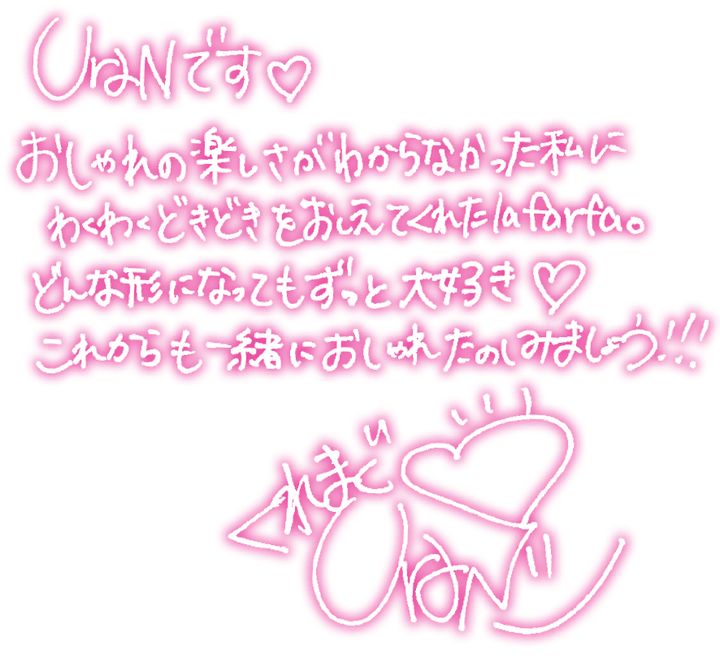 A. 自分自身がla farfaに出会って自分に自信が持てるようになったし、おしゃれすることの楽しさを知ったんです。”このワクワク感をまだ知らないぽっちゃり女子に届けたい!” と思って活動をしてきて「UraNの存在をla farfaで知って、おしゃれするのが今とっても楽しいです」って声を聞いた時、ラファモになってよかったと改めて感じました!