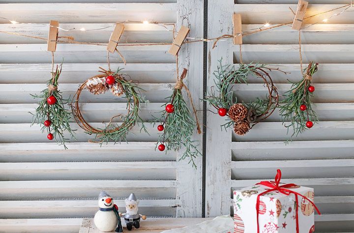 ミニスワッグやミニリースをつなげて作る、クリスマスのガーランドは、家の中のお気に入りの場所や、お手洗いや玄関などちょっとした場所に気軽に飾れます。これがあるだけで、ほっこりとしたクリスマス気分になれますよ。