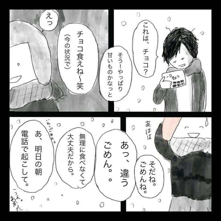 大学受験を控えた彼氏・カンちゃんになかなか会えず、寂しい日々を送っていたかか丸'22(@maru_maru_kazok)さん。ほんの少しの時間でも会えた時はとてもうれしく、楽しい時間を過ごしていましたが、自分の気持ちは伝えず飲みこんでいました。友人のアドバイスを得て、センター試験の前日に差し入れをすることにしたかか丸'22さん。カンちゃんのことを思い悩みながら温かいお茶とチョコを買いますが、カンちゃんの反応は意外なものでした。エッセー作品『絵の具とバレエシューズ』をダイジェストでご紹介します。