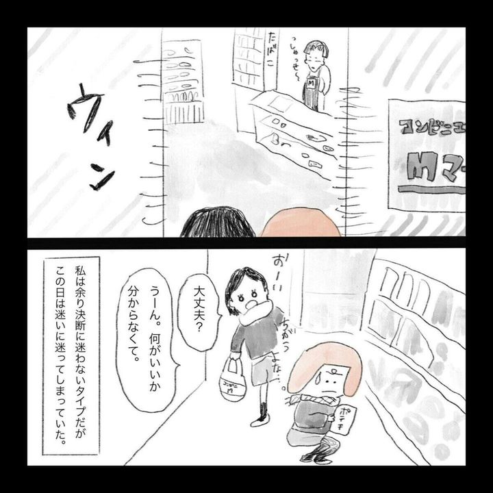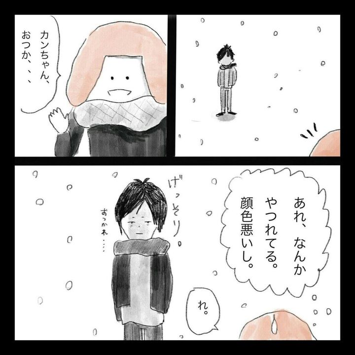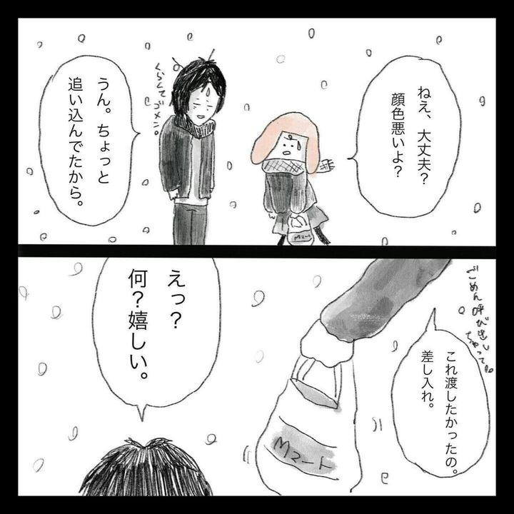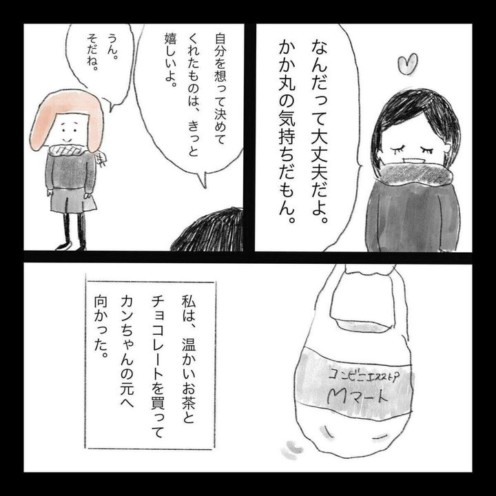そんな時、クラスメートのルンちゃんに差し入れを渡したら?とアドバイスされ、一生懸命コンビニで差し入れを選んだかか丸'22さん。悩みに悩んで温かいお茶とチョコを買いカンちゃんの元へ向かいます。