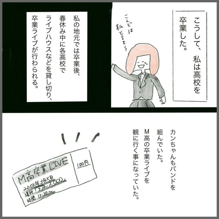 バンドをやっているカンちゃんの卒業ライブを見に行くため、とびきりのおしゃれをして向かうかか丸'22さんでしたが、心の中ではセンター試験前日のできごとでまだモヤモヤとしているようです。
