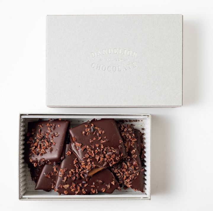 「カカオニブと岩塩をのせた甘塩っぱさがクセになる(ダンデライオン・チョコレート ビジネスデベロップメントマネージャー 物江徹さん)」。バターキャラメルを華やかな香りのカカオ70%チョコレートでコーティング。ザクザク食感がたまらない。1箱 [120g]¥2,400